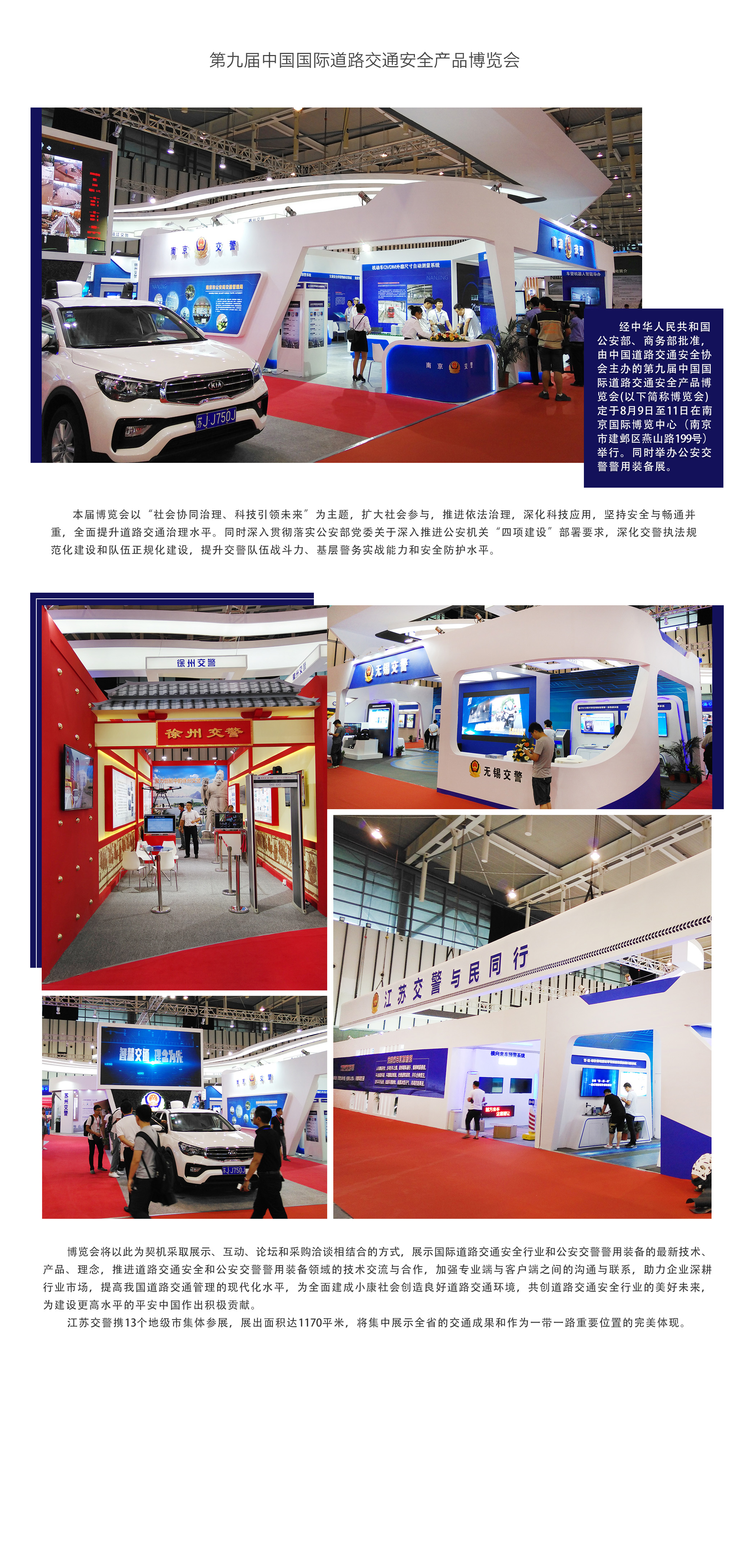 江蘇交警攜13個地級市集體參展,展出面積達1170平米,將集中展示全省的交通成果和作為一帶一路重要位置的完美體現。