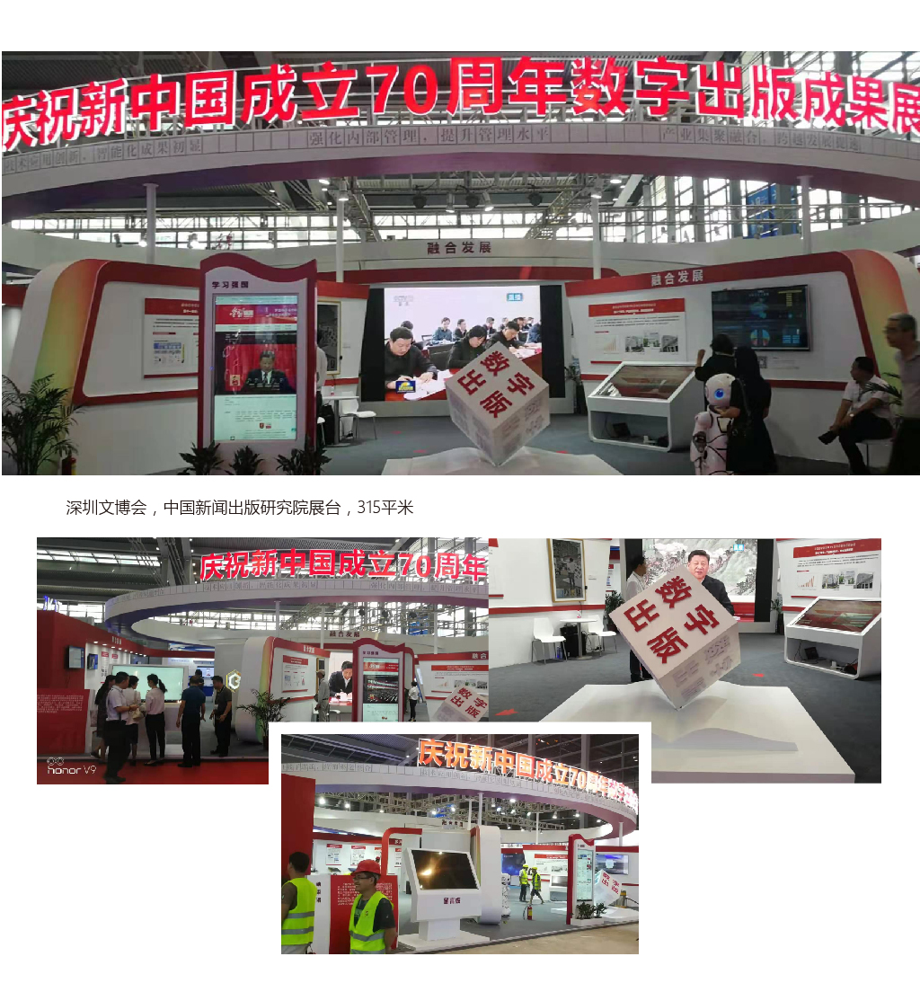 2019年5月16日至20日,第十五屆中國(深圳)國際文化產業博覽交易會將在深圳舉辦,盛典公司負責中國新聞出版研究院展臺的設計與搭建,總面積315平米,得到了甲方的認可和肯定。